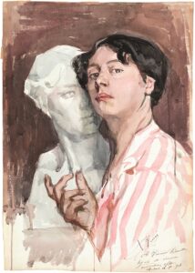 Il rispetto dell’attività manuale spicca nella maggior parte degli autoritratti che Funi ci ha lasciato e che questa mostra raccoglie. Achille pittore si mostra sempre in abiti da lavoro: in canottiera o maglietta bianca sopra a pantaloni di tela, con gli addominali scolpiti dell’affrescatore di pareti che era.