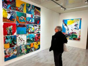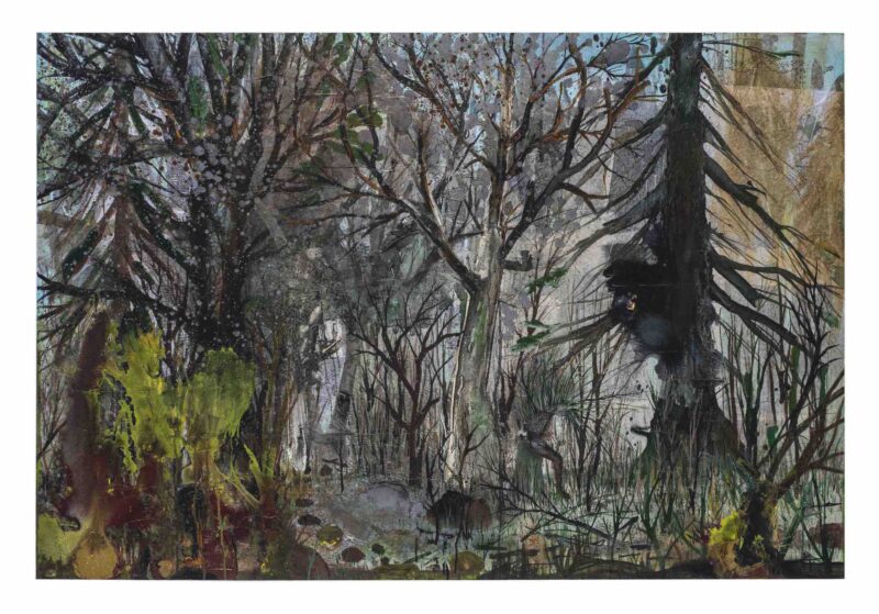 La prima sala esibisce alberi trionfanti e, avvicinandosi meglio all’opera, un albero con miriadi di volatili d’ogni specie e materia che si possono intercettare tra le pennellate stratificate e aeree di Denis Riva.