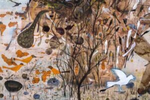 Il tragitto prosegue per arrivare fino a creature marine di ceramica smaltata e microrganismi curiosi che chiazzano le carte come formazioni fungine, collage e composizioni di creature fantastiche. “Abbiamo voluto mettere in scena una riflessione artistica sulla natura e sull’invasione che subisce da parte dell’uomo”, spiegano le curatrici Giulia Giliberti e Sara Ricci.