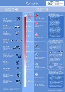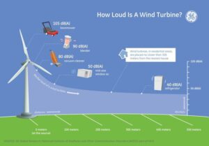La potenza sonora emessa dagli impianti, dichiarata dagli stessi costruttori (si vedano ad esempio le schede tecniche della dita Vestas), è di circa 105 dB (decibel). Ovviamente il rumore diminuisce allontanandosi dall’impianto, ma a 500 metri di distanza rimane comunque alto: 40 dB (rumore di un frigorifero). Si veda l’immagine seguente realizzata dalla General Electric (industria americana che produce impianti eolici, quindi non