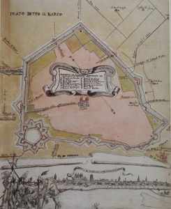 Mappa di Ferrara disegnata da Bartolomeo Gnoli (1645) con ampi spazi verdi a ridosso delle mura cittadine integre