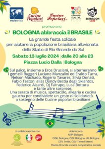 Con il duplice obiettivo di alimentare la speranza e garantire i pasti alle oltre 400 mila persone sfollate, le Cucine popolari di Bologna e di Cervia hanno accolto l’appello lanciato dalla Rede Unida e hanno scelto di gemellarsi con le Cucine popolari di Porto Alegre, Santa Maria e Alvorada. Anche Estragon club e tutte le realtà che collaborano hanno risposto alla chiamata, mettendo la loro competenza per organizzare questa grande festa solidale. Da quando l’emergenza è in corso alcune mense hanno infatti incrementato la loro attività. La cucina Associação de mulheres Maria da glória di Porto Alegre, ad esempio, è passata da 2 a 7 giorni di apertura, e da 600 a 1800 pasti distribuiti alla settimana. Sostenere per il tempo necessario questo impegno è sempre più difficile e l’aiuto della cittadinanza bolognese può fare davvero la differenza. Per questo il 13 luglio sarà lanciata la campagna di raccolta fondi “Bologna abbraccia il Brasile”.
