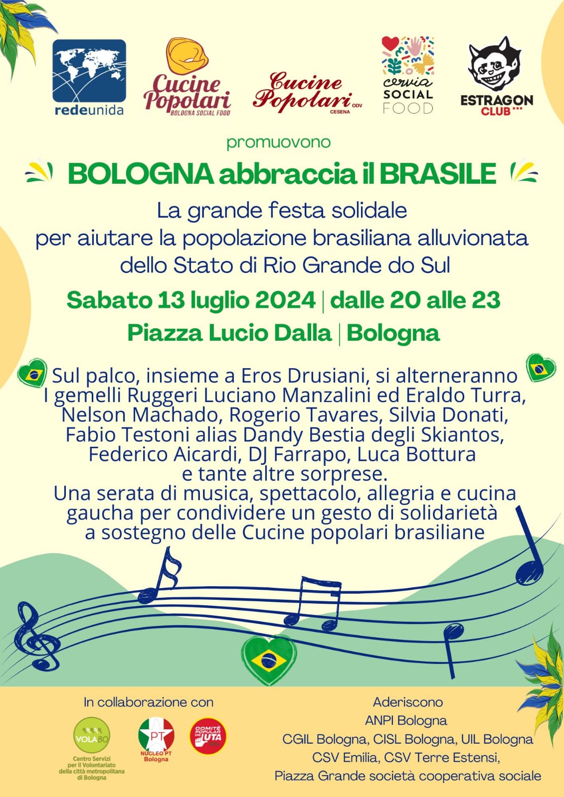 Sabato 13 luglio 2024, dalle 20 alle 23, in Piazza Lucio Dalla è in programma “Bologna abbraccia il Brasile”, una festa solidale che lancerà l’omonima campagna di raccolta fondi per aiutare la popolazione brasiliana dello stato Rio Grande del Sud, alluvionata dalla scorsa primavera. Sarà una serata ricca di ospiti, con tanta musica, la possibilità di gustare cucina gaucha e raccogliere fondi da destinare alle Cucine popolari di Porto Alegre, Santa Maria e Alvorada.