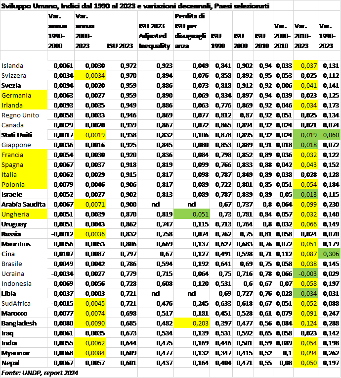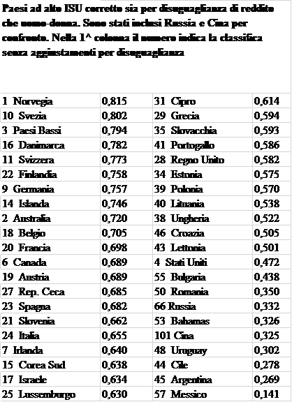 La disuguaglianza interna ai vari Paesi tende a crescere ovunque, facendo abbassare notevolmente l’indice di sviluppo umano. Tutti gli esperti concordano infatti che una società diseguale sfavorisce i cittadini. I Paesi più disuguali perdono fino a un terzo del loro valore nell’indice ISU: SudAfrica -245 (su 721), Bangladesh -203, Brasile -192, Marocco -182, India -169, Nepal -164, Cina -127, Stati Uniti -106. I paesi UE, tra i meno disuguali, perdono meno: Slovacchia (-49) e Ungheria (-51 punti), meno di tutti risentendo ancora dell’esperienza comunista, nonostante siano passati 35 anni, come del resto la Polonia (-89).