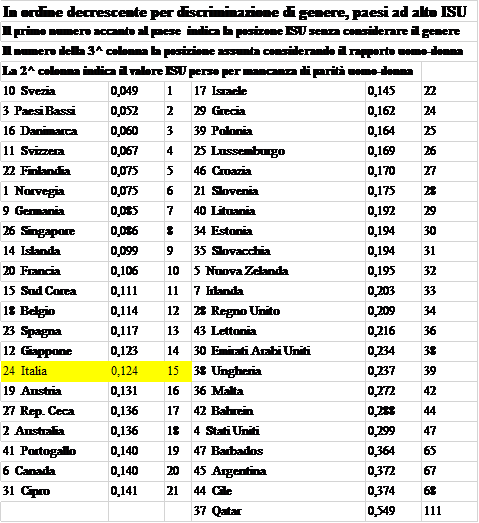 L’Italia farebbe ancor meglio se non fosse considerata la disuguaglianza di reddito che la fa retrocedere, mostrando che ha fatto più avanzamenti nel rapporto di genere che non nella disuguaglianza dei redditi (che cresce).