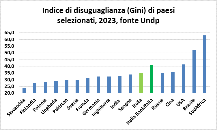 L’indice di disuguaglianza (Gini index) attribuito da UNDP all’Italia è 34,8 (più alto è, più c’è disuguaglianza), ma rammento che l’ultima indagine della Banca d’Italia sui redditi delle famiglie, più accurata delle precedenti, per individuare i reali redditi dei più ricchi e dei più poveri, alza l’indice di Gini da 34,8 a 41,1, come negli Stati Uniti che tanto critichiamo, ma che hanno una tassazione sulle eredità molto più progressista di quella italiana.