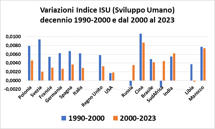I Paesi che guadagnano più posizioni dal 1990 al 2023 sono però quasi tutti extra europei, forse perché partivano da condizioni più arretrate. La Libia è uno dei pochi a calare nonostante la prosperità crescente che aveva creato dagli anni ’70, in quanto è stata “bombardata” da Inghilterra e Francia per portare la “democrazia”, col consenso degli Usa (che coordinavano via Nato dall’Italia) e quello “sofferto” dell’Italia. Un esempio di quanto fosse finta l’egemonia “gentile” occidentale sul mondo.