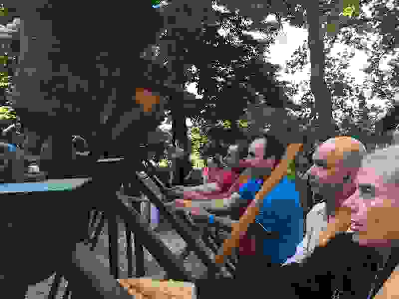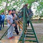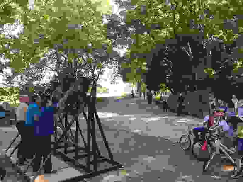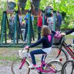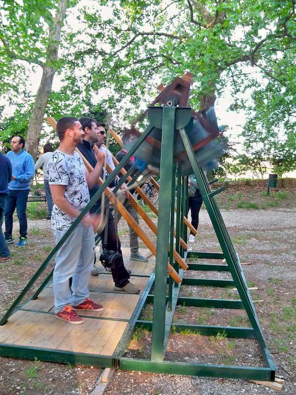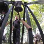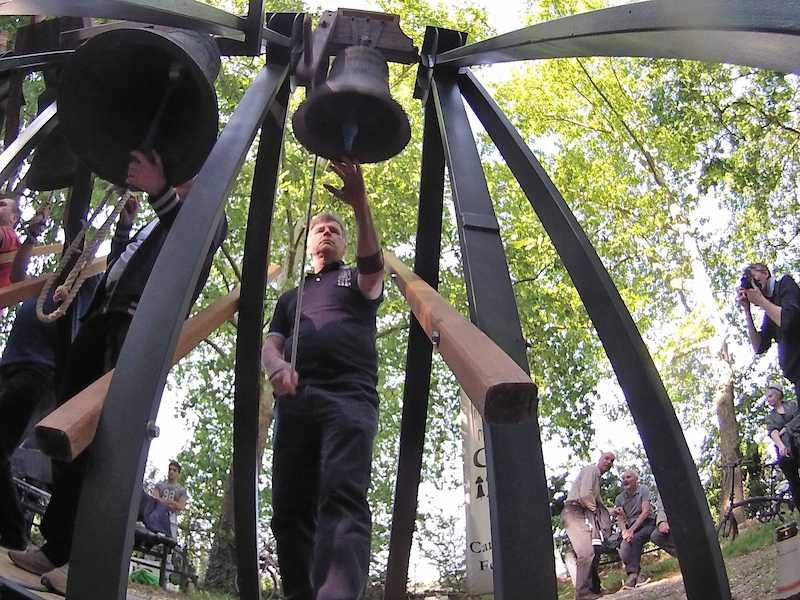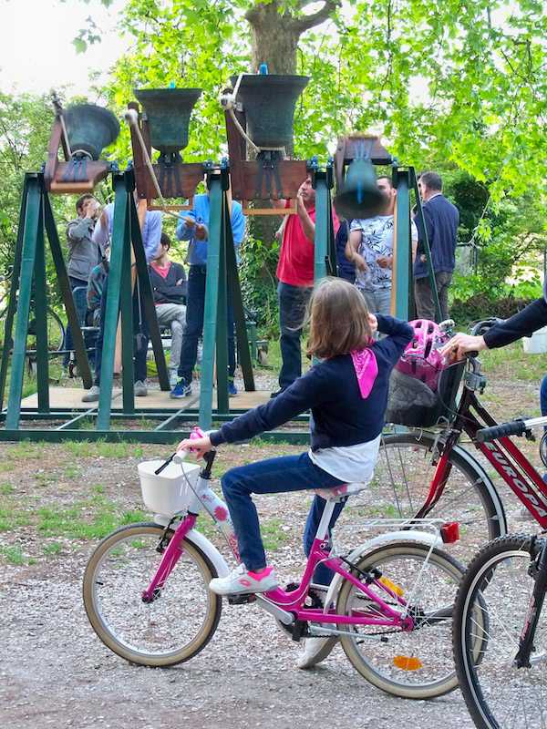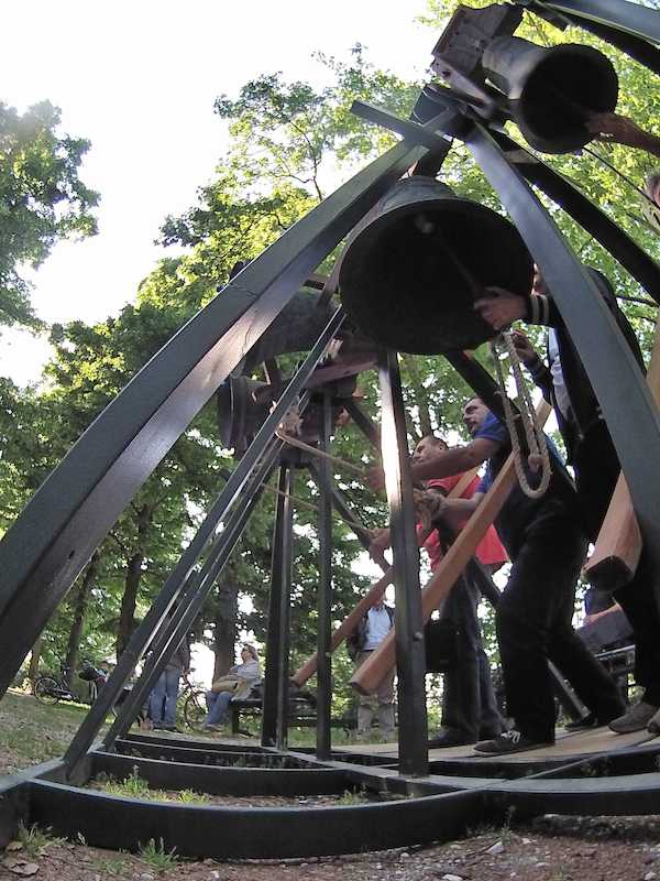 In effetti era proprio così: merito dei Campanari Ferraresi, che per un pomeriggio sono scesi dalle loro torri e hanno portato le campane alla portata di tutti. Sulla Punta della Montagnola, all’ombra degli alberi, famiglie in bicicletta, anziani a passeggio, padroni che portavano a spasso i propri cani, persino alcuni patiti del nordic walking e del jogging si sono fermati per qualche momento a guardare e ad ascoltare questa strana performance che di solito si svolge a decine di metri da terra. E i più curiosi e temerari fra loro, grazie alla guida degli stessi campanari, hanno anche potuto provare a ‘gramare’, come si dice in gergo, cioè tentare di governare una campana.