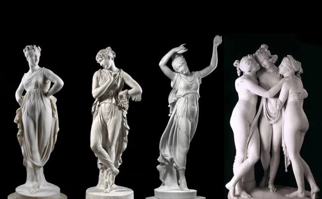 Basti ricordare la Danzatrice con i cembali (1809-1812), la Danzatrice con le mani sui fianchi (1806-1812) che si innalza sulle punte e si volge e solleva con le mani la lunga veste mentre sembra voler richiamare un compagno per unirsi a lei nella danza, affascinato dalla sua seduzione, per capire come quel marmo, pur dalla sua solidità, diventi anima e dia luce ad una vera bellezza in movimento. Anche la Danzatrice col dito al mento (1809) mostra una figura composta, in atteggiamento di riflessione, impegnata in un movimento intermedio in cui un piede poggia sul collo del piede opposto. Se nella prima lo scultore coglie il ritmo qui si sofferma sull’espressione della danza. Per arrivare al meraviglioso triplice abbraccio delle Tre Grazie (1812 – 1817), tre figure stanti, con le braccia intrecciate che circondano i corpi come in una danza leggera. Ma la lista sarebbe ancora lunga.