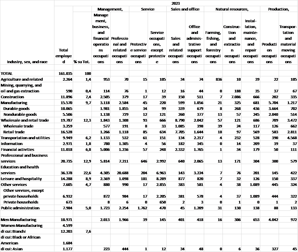 Occupati in USA per settori e tipo di attività, 2023, dati in migliaia