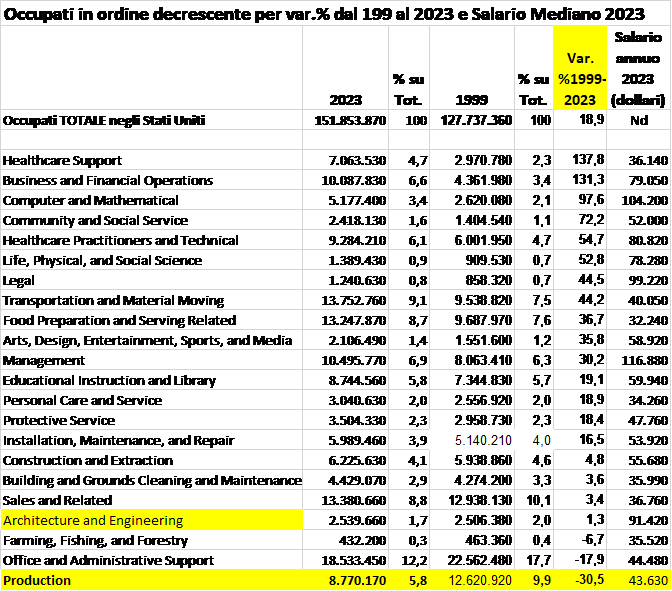 Gli occupati americani non guadagnano lavorando quindi nella manifattura (delocalizzata all’estero). A guadagnare sono invece gli azionisti americani delle multinazionali che sfruttano i bassi costi del lavoro di altri paesi, mentre gli operai americani sono stati falcidiati (una delle ragioni del successo di Trump). Come si può vedere dalla tabella allegata, chi lavorava nella produzione industriale made in Usa nel 1999 (quando inizia ad operare la turbo-finanza e la globalizzazione) ha visto ridursi l’occupazione del 30%, nonostante l’economia americana sia cresciuta del 18,9% come occupati negli ultimi 24 anni (un milione in più all’anno). Da sempre gli Stati Uniti hanno un enorme afflusso di immigrati, per cui non bisogna credere che gli occupati in più siano “bianchi”. Sono quasi tutti messicani e asiatici e ciò spiega perché non aumenta il tasso di occupazione (62%) nonostante l’enorme aumento di occupati, che rimane molto inferiore a quella della media europea. Gli aumenti di occupati sono avvenuti sia nei settori ben pagati della finanza, computer, internet, intelligenza artificiale dove i fisici e matematici ora lavorano, ma anche nei servizi a basso salario come i servizi di supporto alla sanità privata, vendite, ristorazione, pulizie, agricoltura dove lavorano gli immigrati. Si potrà notare che gli ingegneri sono rimasti stabili, nonostante l’enorme aumento degli occupati e del digitale.