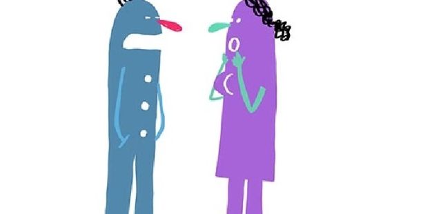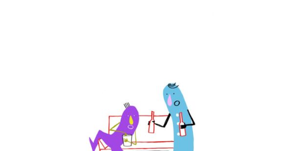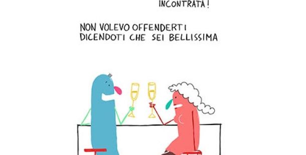 I protagonisti delle vignette sono sgargianti individui che non sembrano appartenere al nostro mondo, forse vivono in un mondo variopinto o più probabilmente i loro colori accesi spiccano in un mondo all-white; un avatar del nostro contesto quotidiano, dove ciascuno di loro assomiglia a tutti e non assomiglia a nessuno. In fondo diverte l’idea di identificarsi con sagome fluo col naso a pera, ma voglio credere che anche questo può contribuire a guardarsi “da fuori” per sorridere e riflettere su ciò che siamo e ciò che stiamo diventando.