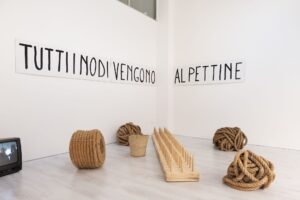 Tra le opere in mostra è presente la rievocazione di Annodare, azione compiuta da Cintoli alla celebre galleria romana L’Attico di Fabio Sargentini nel marzo 1969. L’installazione si compone di un grande pettine in legno, della scritta “tutti i nodi vengono al pettine” e di una serie di gomitoli di corda (nodi) di differenti dimensioni, che il pubblico nel corso della storica performance poteva sciogliere, riannodare e manipolare liberamente.