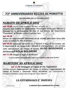 Con le prossime cerimonie di sabato 22 e martedì 25 aprile, a ricordo del 72° anniversario degli Eccidi di Porotto, entrerà nel vivo il calendario degli appuntamenti proposti dal Comitato ferrarese per le Celebrazioni 25 aprile* per ricordare il 72° anniversario della Liberazione, che fino al 2 maggio ha in serbo molte iniziative per coinvolgere la cittadinanza (vedi l’elenco a fondo pagina). Questi gli appuntamenti.