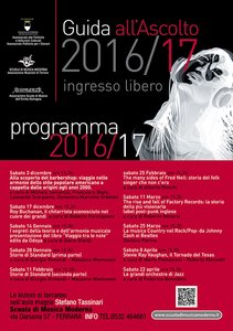 Per il quattordicesimo anno consecutivo, allo scopo di promuovere la cultura e l’educazione musicale in tutte le sue forme moderne, l’Associazione Musicisti di Ferrara-Scuola di Musica Moderna, in collaborazione con il Comune di Ferrara-Assessorato alle Politiche e Istituzioni Culturali, Assessorato Politiche per i Giovani, organizza per l’ anno 2016-2017 una serie di 10 appuntamenti nell’aula magna Stefano Tassinari della Scuola di Musica Moderna di Ferrara in via Darsena 57; gli incontri sono ad ingresso libero e hanno come temi la guida all’ascolto dei generi musicali moderni più importanti.