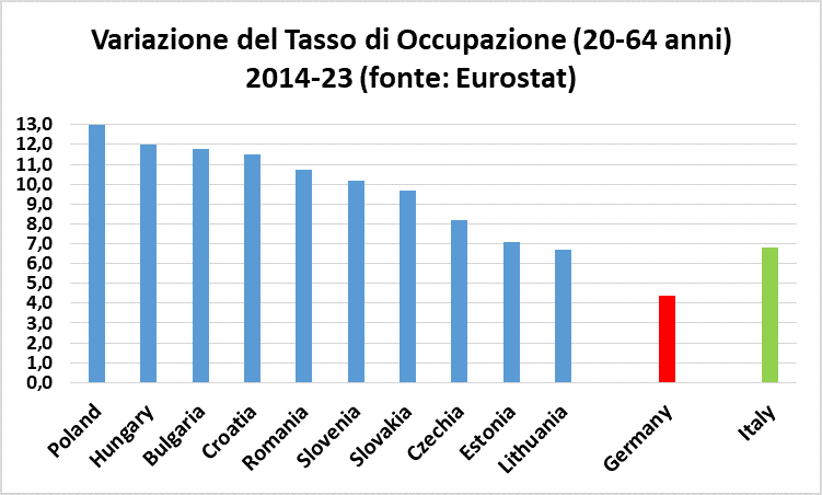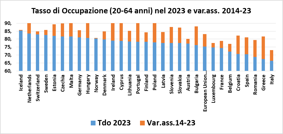 Nonostante infatti ogni trimestre si dica che gli occupati italiani crescono, il tasso di occupazione dai 20 ai 64 anni sulla popolazione è in Italia nel 2023 il più basso in Europa (66,3%), 10 punti inferiore alla media UE 27 e sotto la stessa media dei paesi dell’Est Europa, che quando sono entrati nel 2004 stavano molto peggio di noi.