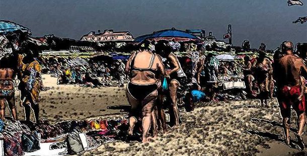 Così osservo con indulgenza la carne tremula delle ultime ostinate palpeggiatrici della mercanzia esibita dai dannati della terra che al contatto con l’oggetto hanno spasimi di piacere. Alcune ormai immuni da improbabilissime multe convocano, imperiose, sotto l’ombrellone il ‘negro’ per dagli le ultime commissioni.