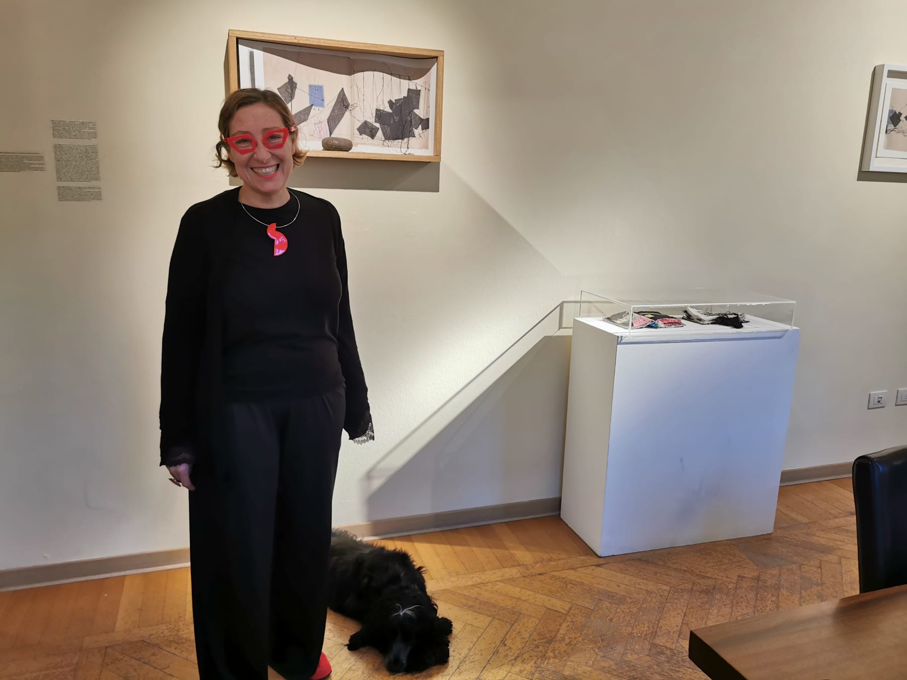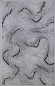 Dadamaino, pseudonimo di Edoarda Emilia Maino, è un’artista italiana che ha contribuito ai movimenti dell’avanguardia artistica milanese degli anni Cinquanta con le sue ricerche geometrico-percettive. In esposizione c’è una sua opera a segni fluttuanti in bianco e nero “Passo dopo passo” (mordente su poliestere, 1989) che Maria Livia descrive come “rappresentazione metaforica del destino biologico ed esistenziale delle persone che si incontrano, si amano, si allontanano, cambiando costantemente flussi di relazioni ed emozioni”. Sulla superficie trasparente del poliestere, il mordente segna tratti più o meno scuri che creano linee ondivaghe, a simulare il movimento incessante dei rapporti che possono segnare lo spazio di un’esistenza.