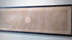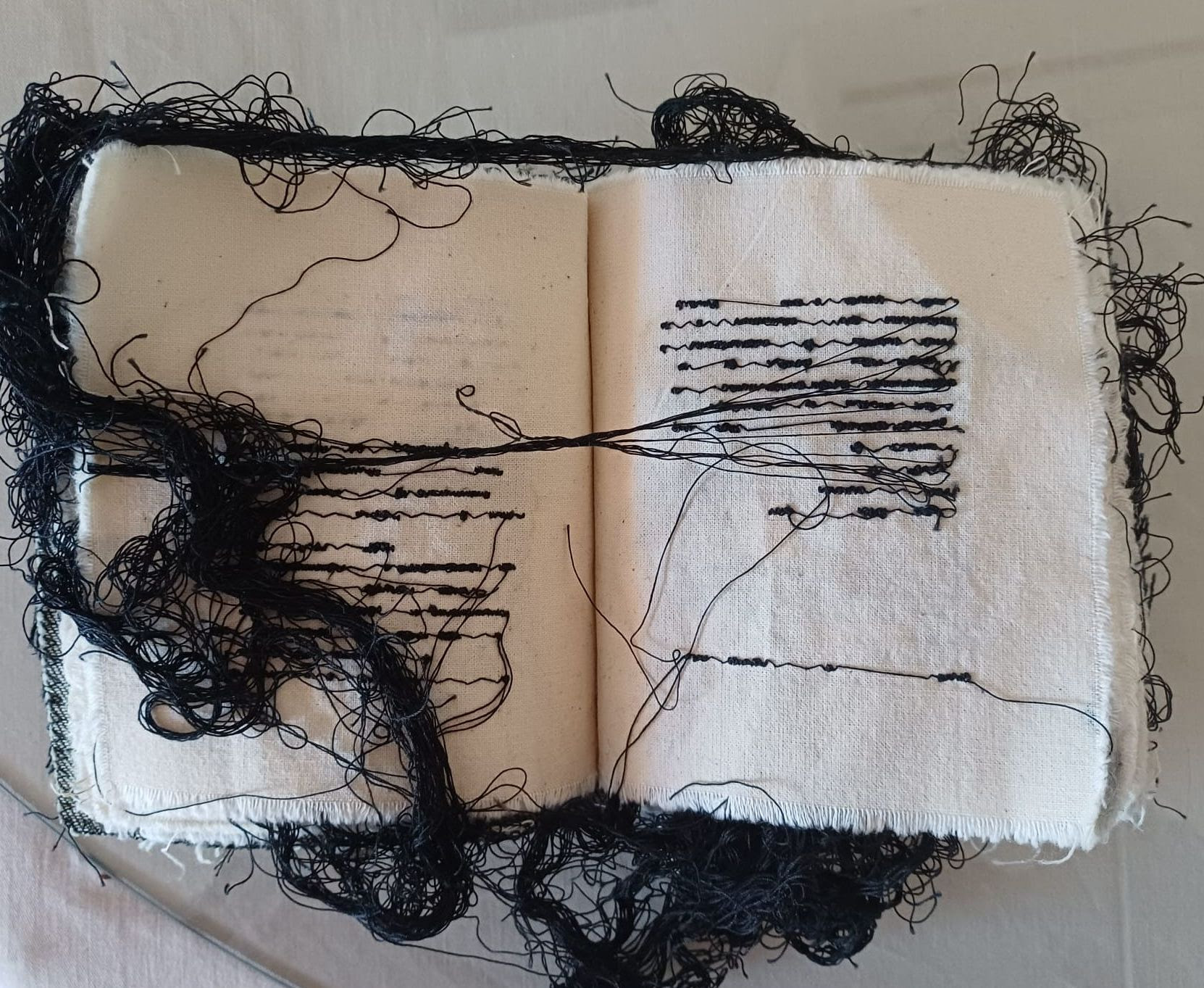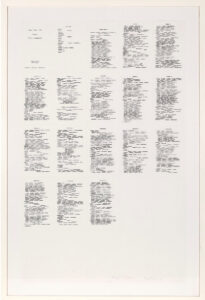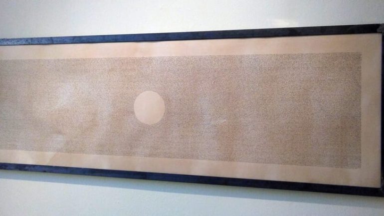 In un’altra sua opera, l’intero romanzo “Olga” di Chiara Zocchi è trascritto in modo da lasciare un perfetto cerchio bianco al centro del lungo rettangolo, denso dei caratteri calligrafici del libro. “Quel punto centrale è il simbolo del vuoto interiore che pervade la protagonista della storia”, spiega l’artista.
