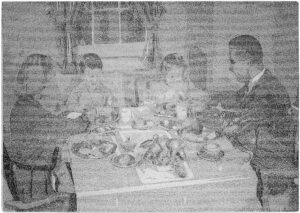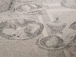 Il testo scritto con punta di penna più o meno fine va ad illustrare una tavola apparecchiata attorno alla quale siedono madre, padre, bambina e bambino in un’atmosfera da America anni Cinquanta. Il titolo dà un significato contrastante alla rappresentazione – che è poi quella del romanzo – per chi avesse voglia di leggere il disegno riga per riga, che riproduce tutto il testo, in lingua originale, di A sangue freddo di Truman Capote. L’immagine è infatti quella di una felice famiglia americana davanti a una ricca colazione d’oltre oceano, eppure allude a uno dei delitti più efferati, reso celebre dal romanziere statunitense nella sua narrazione basata sul quadruplice omicidio realmente accaduto nella provincia americana alla fine degli anni Cinquanta.