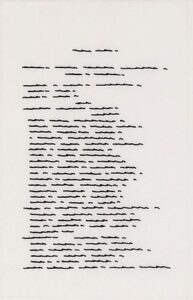 Il libro della Blanck è tratteggiato nel suo aspetto tecnico, interno, riprodotto come immagine pagina per pagina, ma privato del contenuto specifico. Le parole sono infatti disegnate tramite un tracciato indecifrabile, inserito nella struttura compositiva dei fogli, mantenendo il ritmo delle righe, la disciplina della gabbia tipografica. “Il gesto – si legge nella descrizione in mostra – diventa ripetuto, meditativo, totalizzante. Un corpo a corpo con la superficie, dove il tempo diventa parte dell’opera e il segno, tracciato in uno stato quasi meditativo, conduce a una dimensione spirituale nutrita di silenzio e concentrazione. Una calligrafia interiore dal sapore metafisico”.