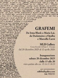 “GRAFEMI. Da Irma Blank a Maria Lai, da Dadamaino a Opalka e Marcello Carrà”, MLB Gallery, corso Ercole I d’Este 3, Ferrara, 20 dicembre 2025 – 12 aprile 2026. Visite guidate gratuite dalle 15 alle 19 con prenotazione telefonica al cell. 346 7953757