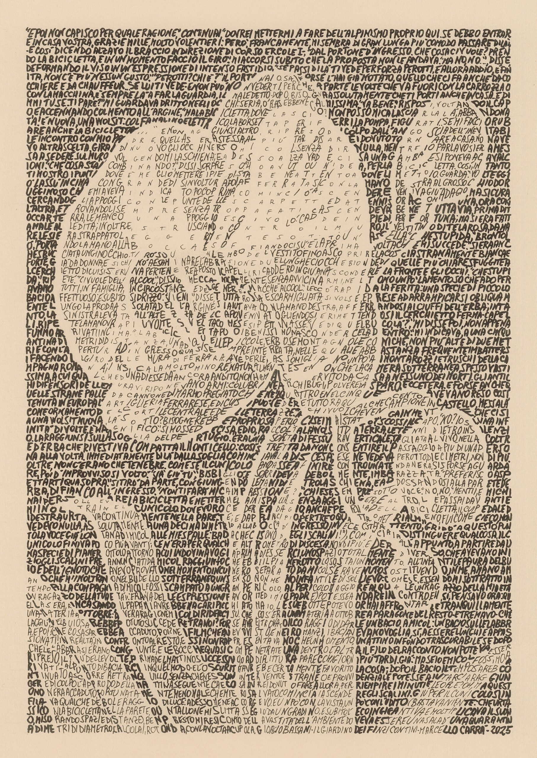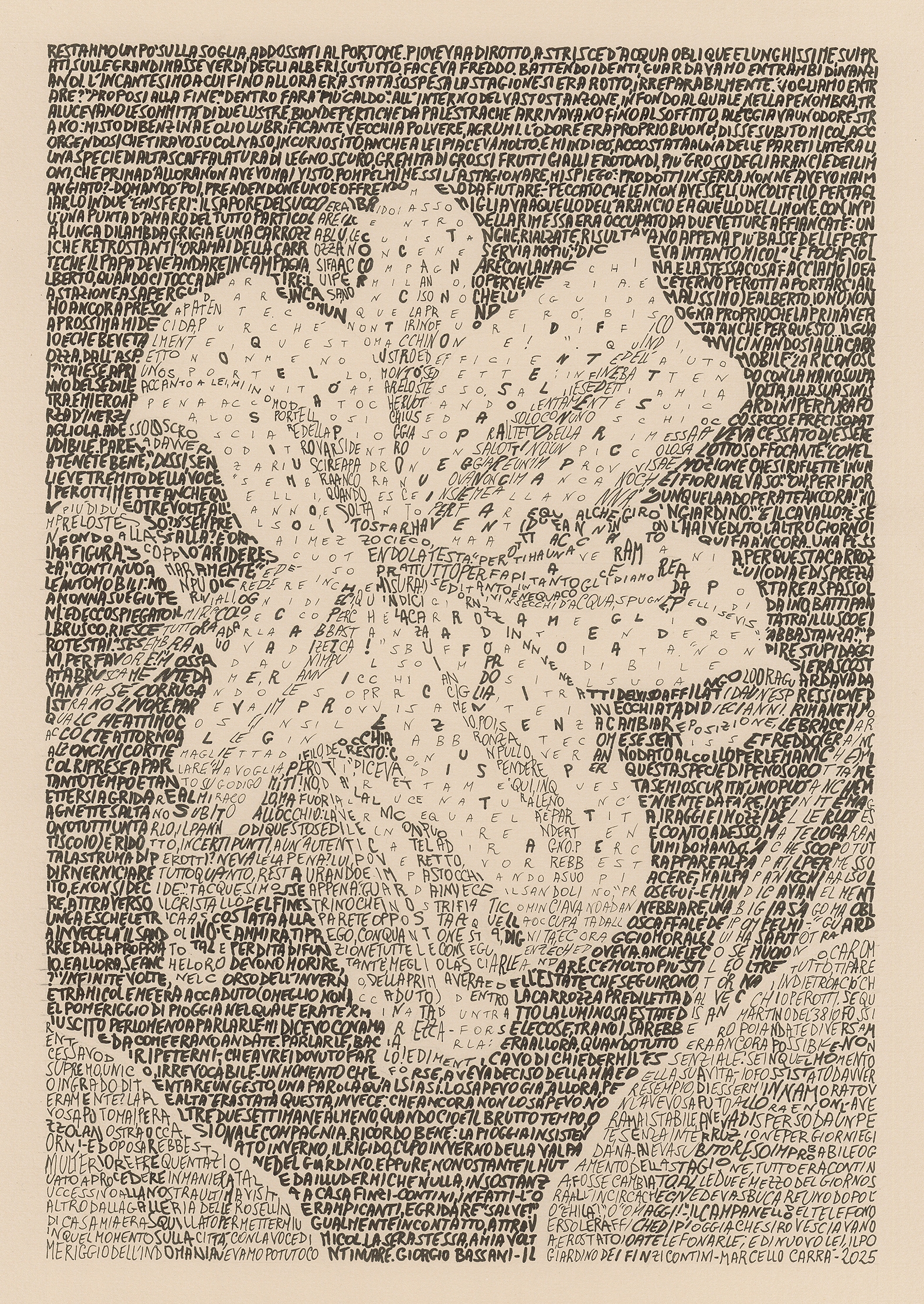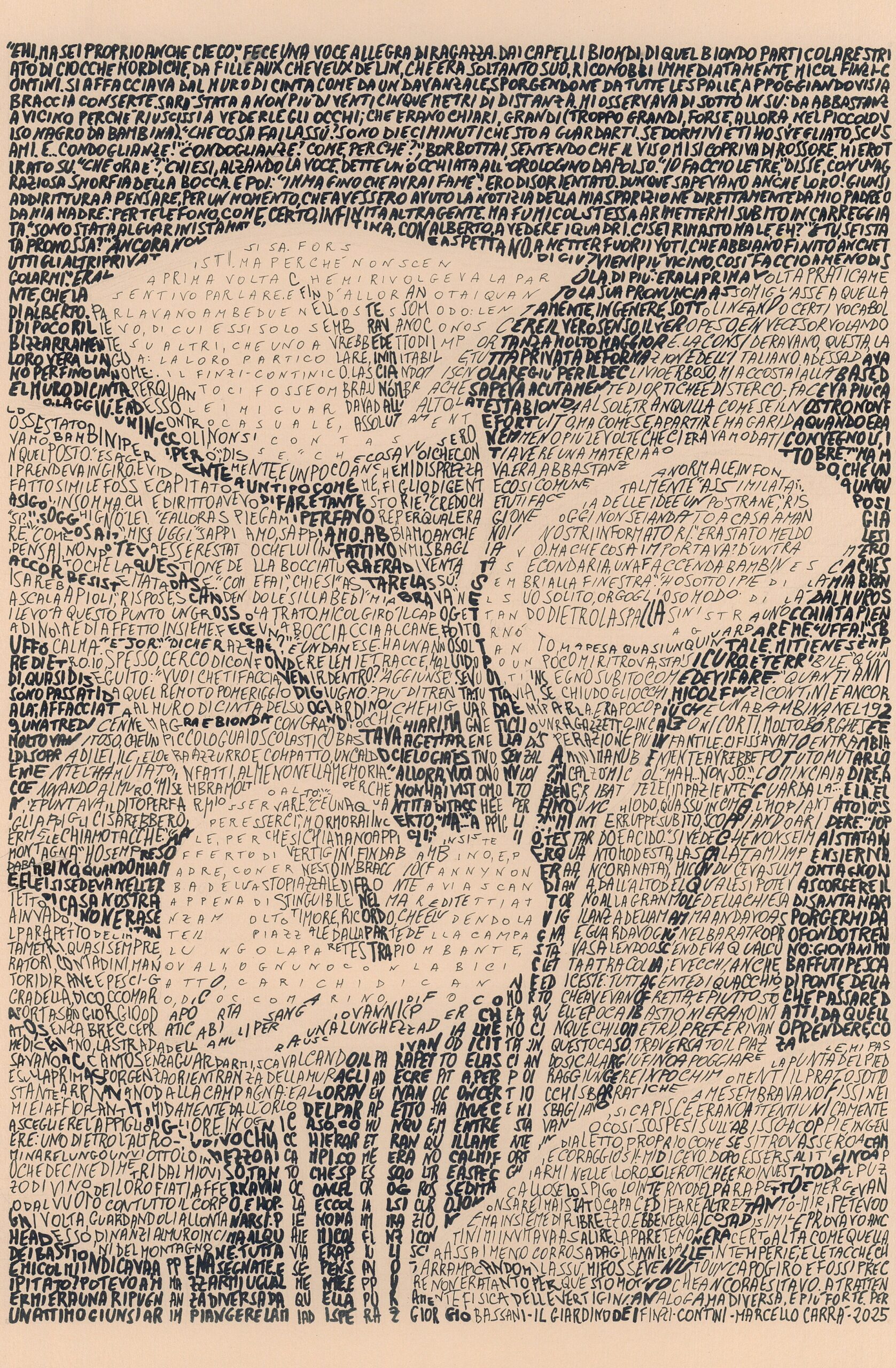 Marcello Carrà – che ha debuttato nel mondo dell’arte con i suoi insetti meticolosamente disegnati a penna bic su fogli di grandi dimensioni – qui espone una serie di lavori dove la parola è sempre parte integrante della composizione. Brani tratti da “Il Giardino dei Finzi Contini” servono, ad esempio, a tracciare lo sfondo di un trittico di soggetti floreali.