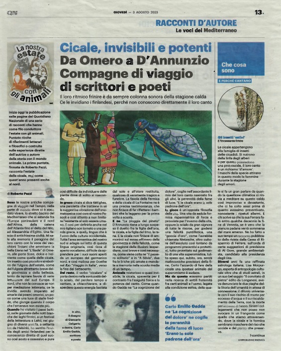 Con il poeta Umberto Saba concorderebbe, però, un’altra mia amica, Paola, che vive nella campagna ferrarese e forse proprio per questo non manca occasione di comunicare la sua disillusa visione della natura, scacciandone ogni lettura idilliaca e magari un po’ irrealisticamente sognante. Perché Saba – come la Paola – nota: “Quand’ecco da tutti/ gli alberi un suono s’accorda,/ un sibilo lungo che assorda,/ che solo è così: le cicale”. Anche per lei sono bestie assordanti. E, se mi azzardo ad accennarle la possibilità di un’uscita all’aperto in questa nostra estate padana, mi risponde brutalmente che non ne vuole mezza di fare quella che per lei non sarebbe che un’ingiustificabile “immersione tra zanzare e cicale”, già provvista com’è – assicura – di punture di altri aggressivi insetti, per i quali ha previdentemente in serbo speciale (e specifica) crema antibiotica.