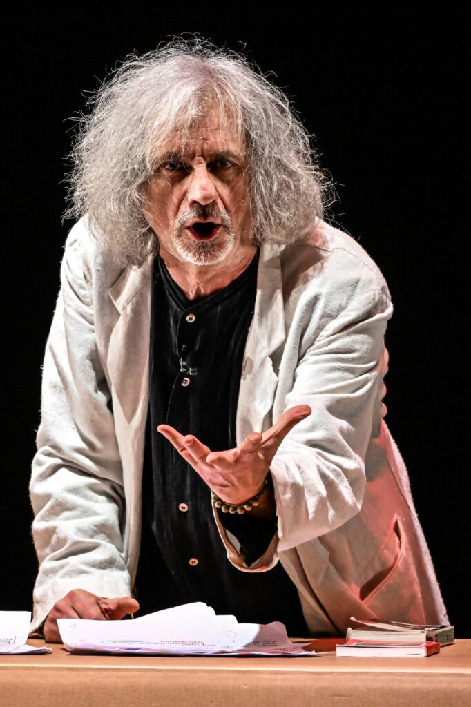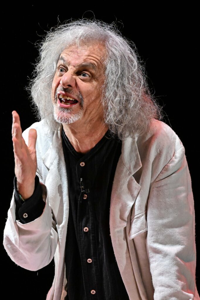 La sua chioma vistosa ed un lungo camicie bianco che indossa per quasi tutto l’atto unico mi ha ricordato il dottor Emmett Brown, lo scienziato pazzo del film “Ritorno al futuro”, interpretato splendidamente da Christopher Lloyd.