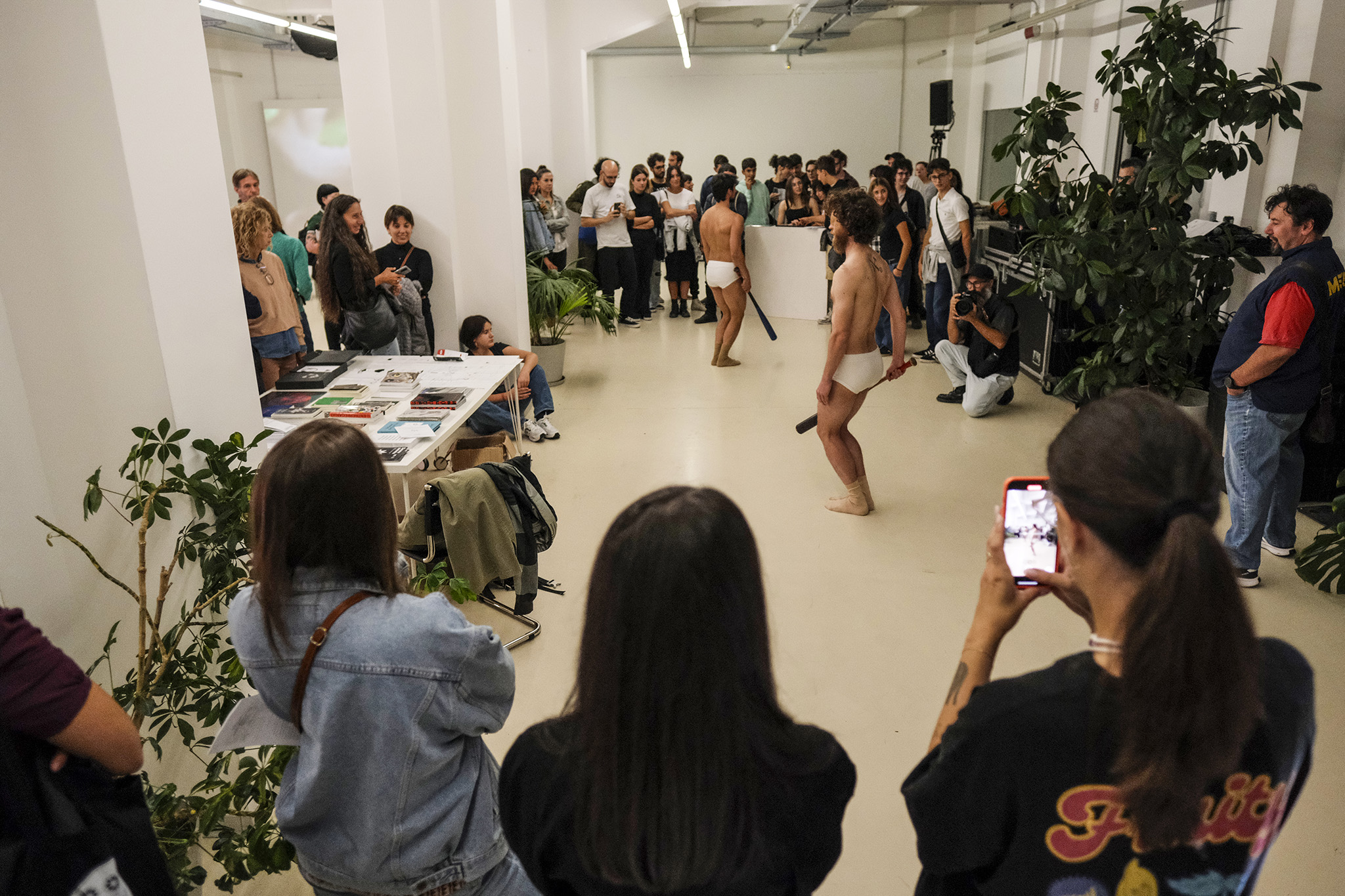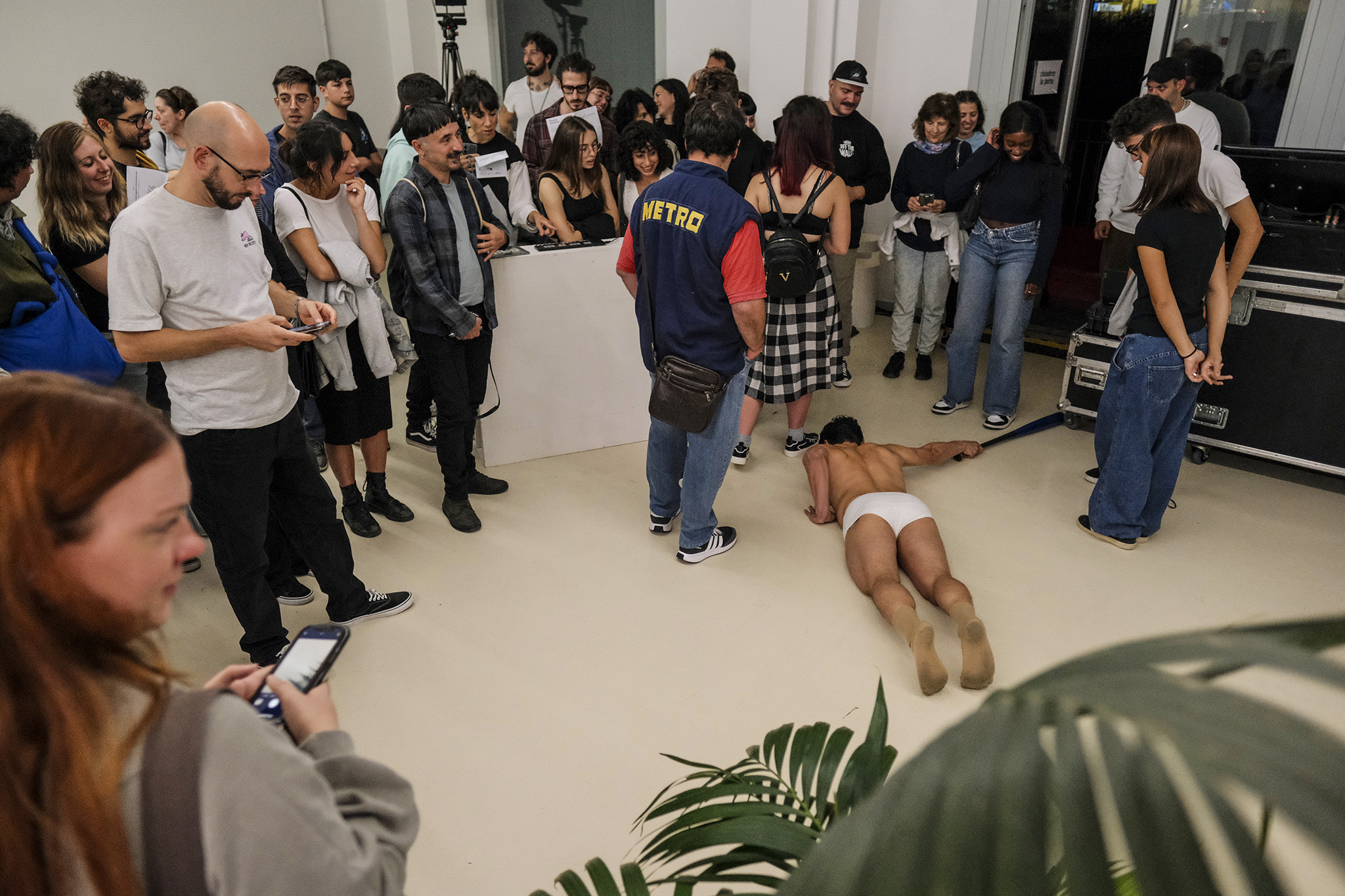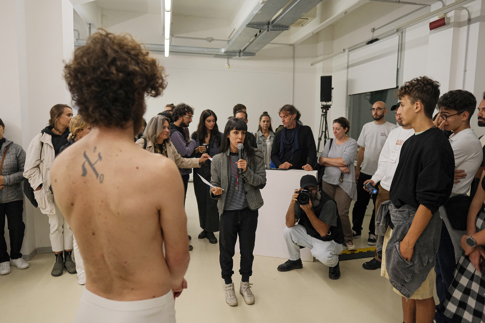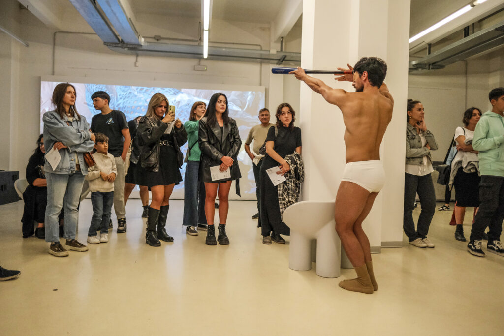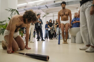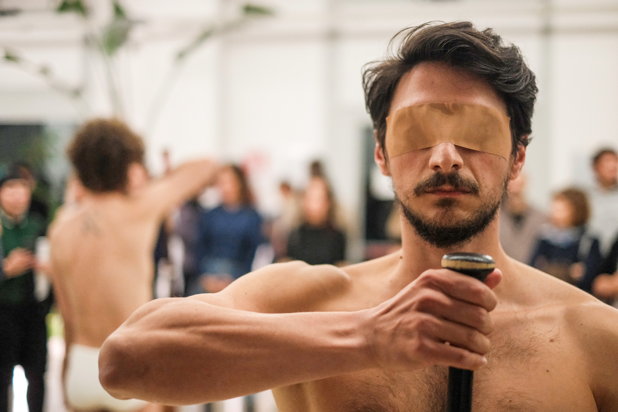 La performance è pensata come “un dispositivo coreografico interattivo”, che permette al pubblico di determinare i movimenti dei performer. Ecco allora che la comparsa dei protagonisti, dirompenti nella loro pura corporeità e con gli occhi celati da una benda color carne, si fa anche inquietante in virtù della mazza da baseball che viene loro assegnata.