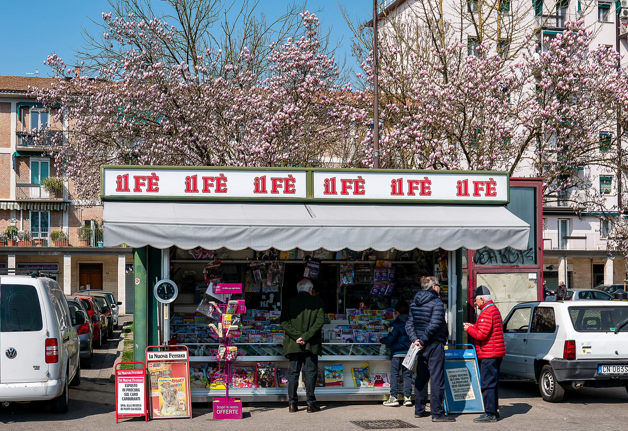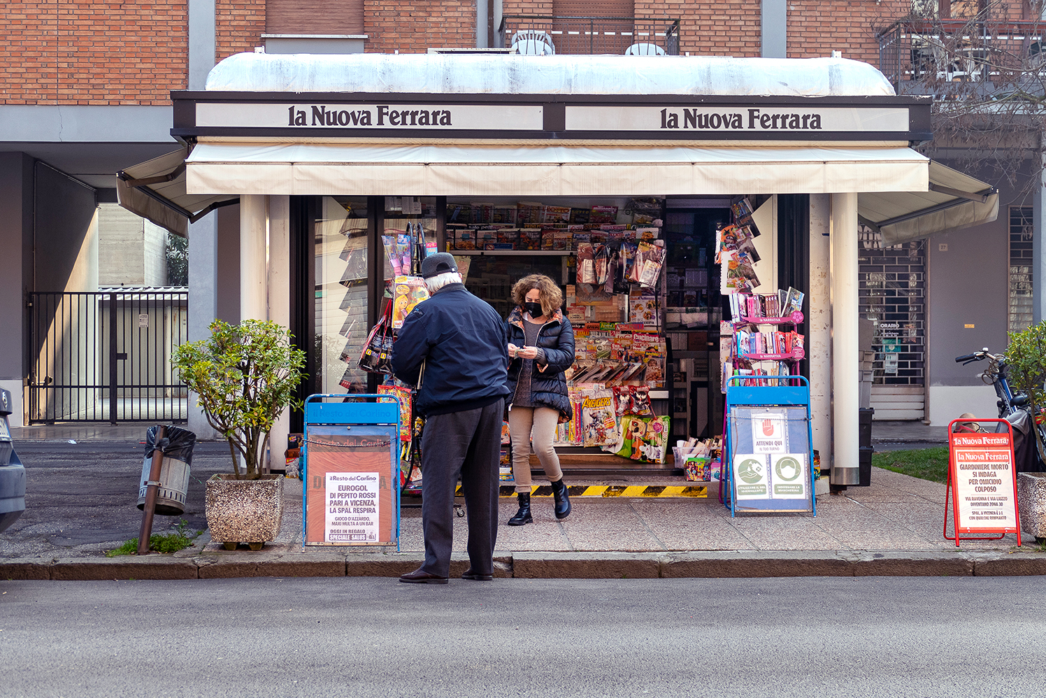 “Il progetto fotografico – dice Wienand – è iniziato nel 2019 con l’idea di raccontare la vita intorno alle edicole e la loro collocazione nell’ambiente urbano di Ferrara, dedicando uno sguardo particolare alle persone in relazione al luogo e fra di loro. Durante il lockdown poi la coda di attesa a prendere il giornale era rimasta fra le poche occasioni di contatto sociale”. Così il reportage è andato avanti focalizzandosi su diversi aspetti. “In alcuni degli scatti – racconta l’autore – il contesto urbano ferrarese fa da meravigliosa cornice: il campanile di San Giorgio, la Cattedrale, una gigantesca magnolia in fiore, e così le biciclette e la nebbia sottile”.