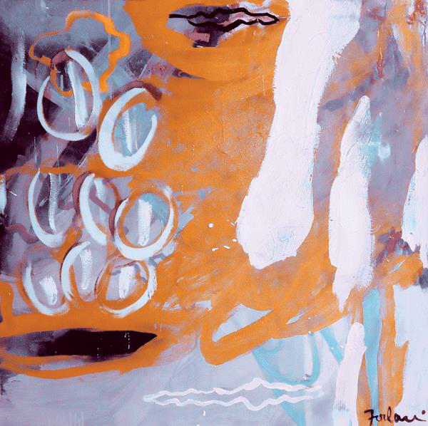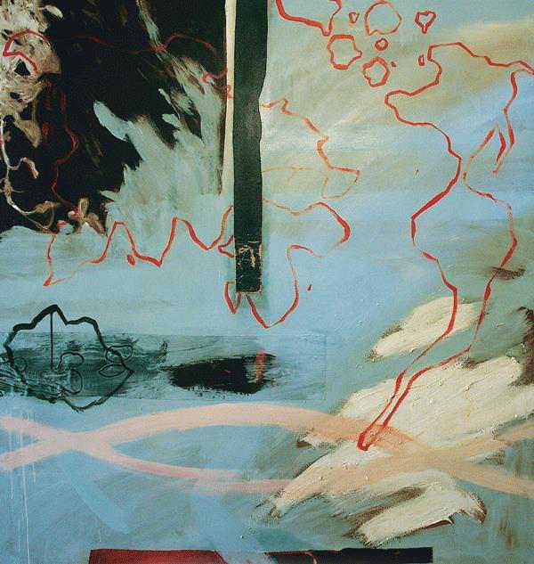 Cicatrice – Quello che pare un fiume in piena che scorre fra case e campi irrigati (a prima vista il quadro mi ricordava molto una delle fotografie di Yann Arthus-Bertrand della terra vista dal cielo) è, in realtà, un’opera intensa che fa parte di una serie chiamata “cicatrici”. Dal 1995, Andrea ha dipinto questa serie, che prende spunto da una cicatrice di 50 punti che ha su una gamba. Non ne ha un numero definito perché, come per le altre ricerche, l’artista continua a produrne, quindi più che un periodo rappresentano qualcosa da dire, non una ripetizione ma un altro pezzo di frase, nuovo.