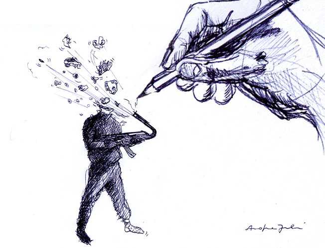 Magari – Vignetta realizzata dopo i fatti parigini di Charlie Hebdo. Perché questo titolo? “Semplice. Perché l’artista avrebbe preferito che gli attentatori avessero puntato su se stessi l’arma.