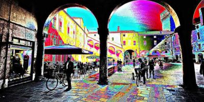Per continuare col reticolo di circonvallazioni che dovrebbero evitare l’attraversamento della città da parte del traffico di passaggio, dove la trama del non-finito si dispiega compiutamente nei cavalcavia che puntano spavaldi verso il cielo e lì si fermano in attesa che qualcuno si decida a tirar su l’altra metà, nelle ruspe che tracciano alacri le nuove bretelle che avrebbero dovuto essere completate già da decenni, nella ferrovia che continua a segare in due via Bologna nonostante i progetti del suo interramento risalgano all’epoca dei moti carbonari. E con gli edifici dell’immediata periferia, nei quali lo struggimento del non-finito erompe dai vetri rotti, il calcestruzzo sbrecciato, le finestre dagli infissi divelti che occhieggiano come orbite vuote di teschi e fanno tanto arredo urbano. Per non dire delle piste ciclabili, che avviluppano la città in un affascinante nastro rosso costellato – per restituire compiutamente il senso di suggestiva imperfezione che promana dall’antica città di cotto – di buche, rigonfiamenti, crepe sapientemente intervallate da palozzi in ferro che spuntano come funghi dall’asfalto nel mezzo esatto del passaggio, sostituendo efficacemente la banale segnaletica orizzontale a base di strisce bianche riservata alle auto.