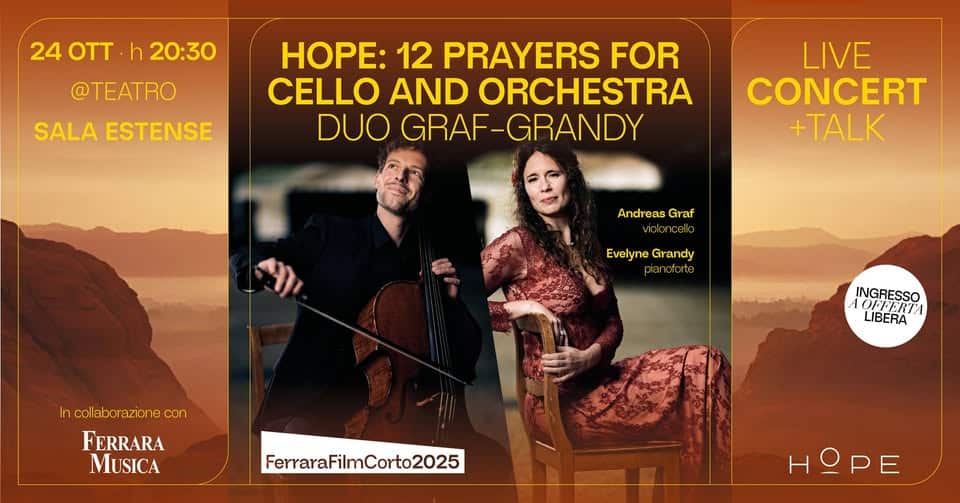 HOPE: 12 PRAYERS FOR CELLO AND ORCHESTRA — Andreas Graf, violoncello / Evelyne Grandy, pianoforte. Concerto di presentazione in anteprima esclusiva del progetto artistico e umanitario “HOPE: 12 PREGHIERE PER VIOLONCELLO E ORCHESTRA” ideato dal violoncellista e regista svizzero Andreas Graf, anche membro della Giuria Professionale FFCF 2025.