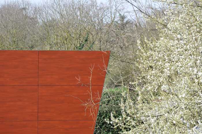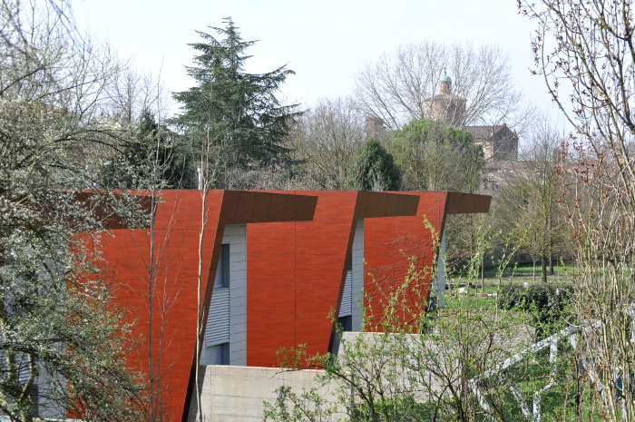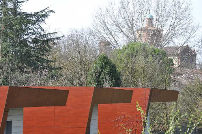 Vista così, non sembra la parete di una casa dal tipico design norvegese? Le linee essenziali e quel legno rosso scuro… Poi, appena si ingrandisce la visuale e appaiono le Mura e, sullo sfondo, la chiesa di San Cristoforo, la si riconosce subito, è Ferrara. Sicuramente tra i ferraresi ci saranno opinioni discordanti sull’estetica di questa abitazione e sull’opportunità di costruirla in pieno centro storico. Ma una cosa è certa: a guardarla non è affatto male, ricorda altri luoghi, altri paesaggi e soprattutto mette una gran voglia di partire verso nord!