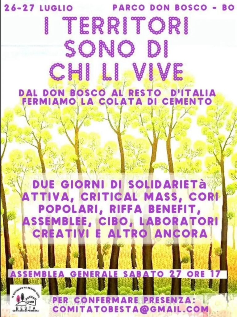 Nella temuta imminenza di un nuovo tentativo di sgombero, il Don Bosco chiama a raccolta solidali, comitati civici, realtà ambientaliste e tutti i movimenti per la difesa del territorio di Bologna e del resto del paese per il 26 e 27 luglio, per un incontro di coordinamento, scambio, mobilitazione e convivialità. Per affermare che i problemi del territorio si devono affrontare a livello politico e non con i manganelli.