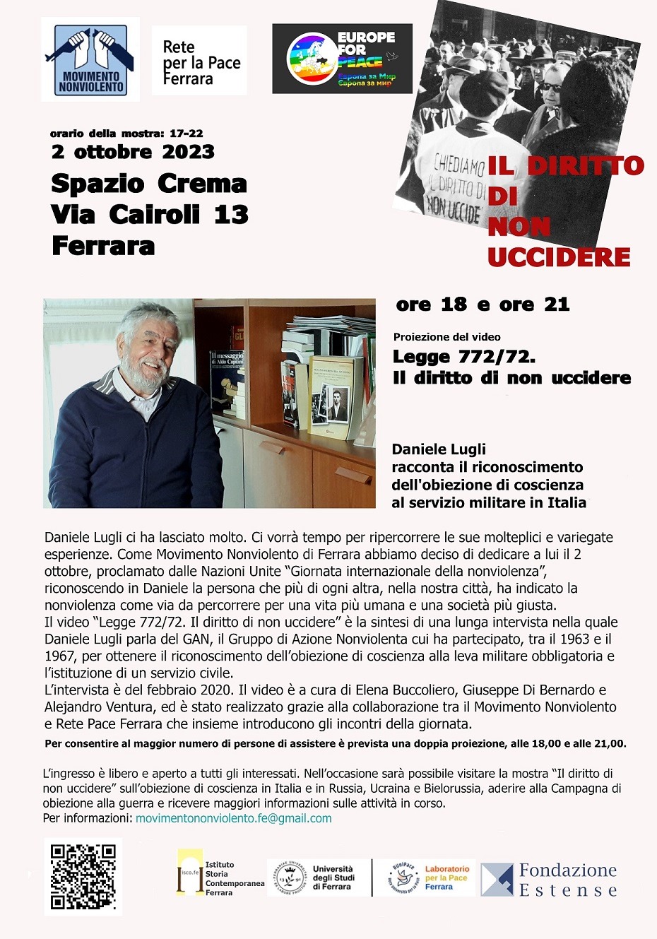 “Il diritto di non uccidere”, una mostra e una settimana di iniziative cittadine sul tema dell’obiezione di coscienza alla guerra programmata tra il 2 e il 3 ottobre 2023, a cura di Movimento Nonviolento e Rete della Pace di Ferrara.