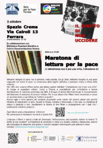 Una ricca rassegna di eventi cittadini si svolgerà presso Spazio Crema (Via Cairoli 13, Ferrara). La promuovono il gruppo locale del Movimento Nonviolento e la Rete della Pace di Ferrara nell’ambito della coalizione Europe for Peace, e ha il patrocinio della Fondazione Estense, dell’Istituto di Storia Contemporanea e del Laboratorio per la Pace dell’Università di Ferrara.