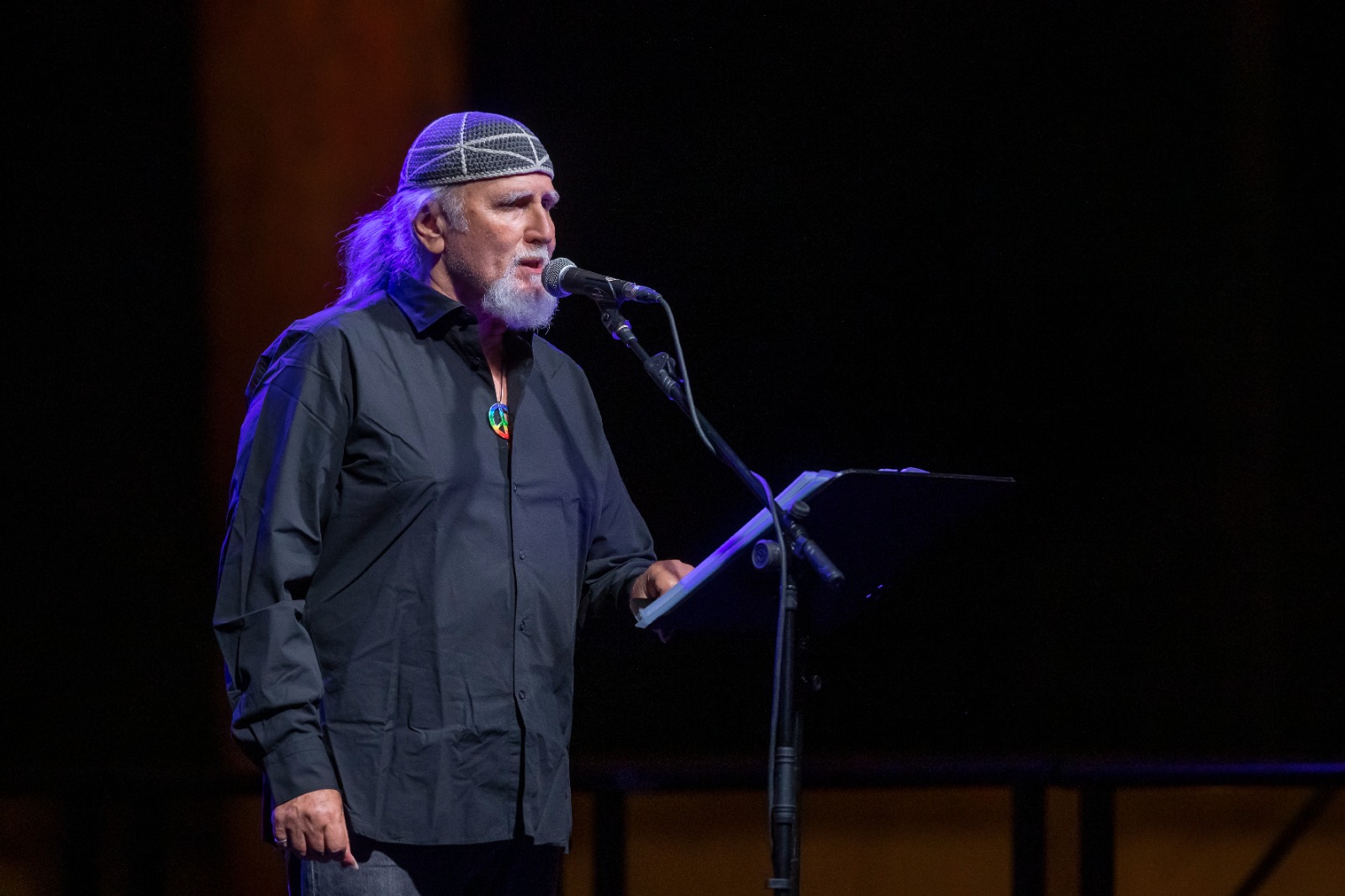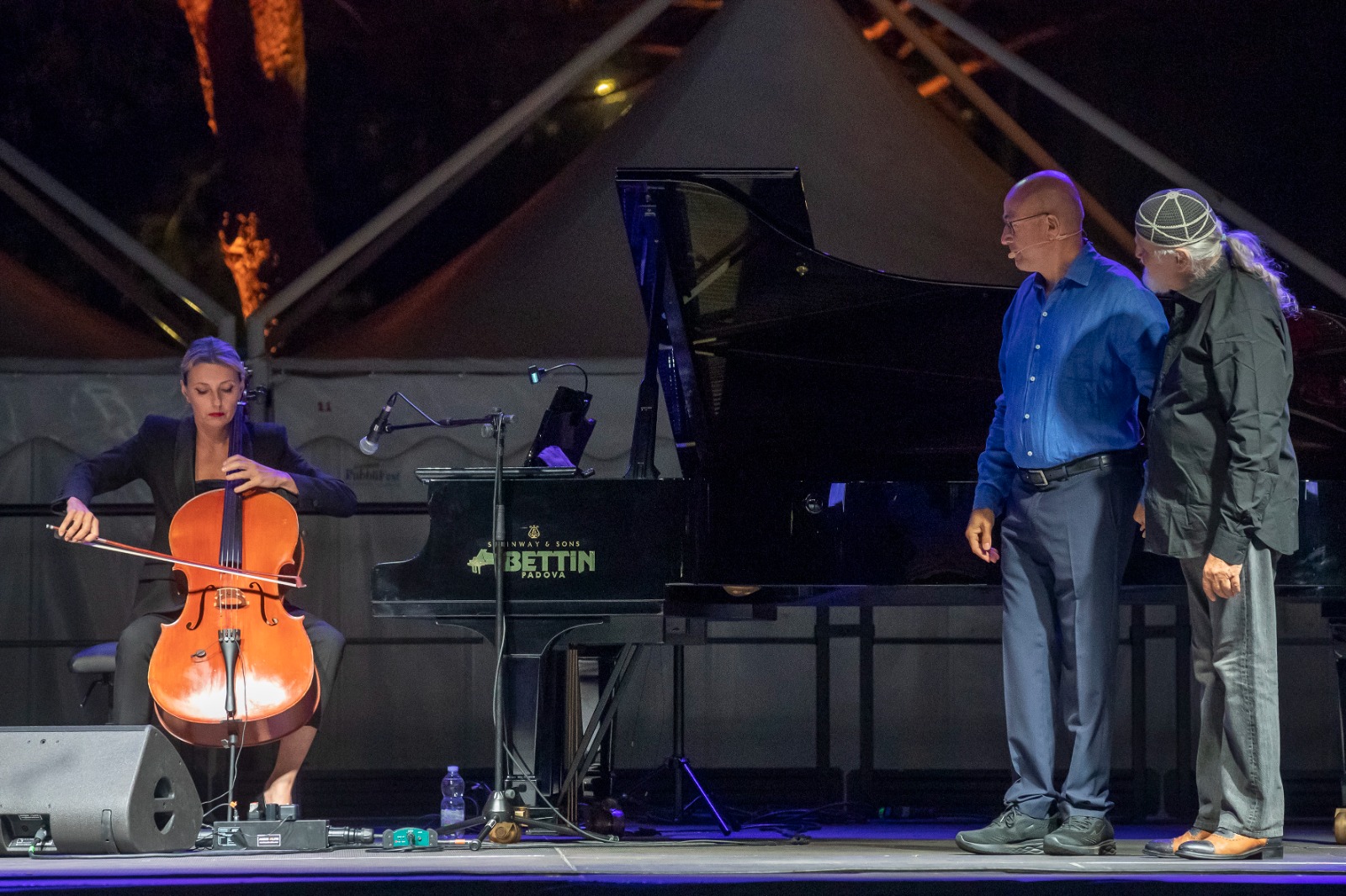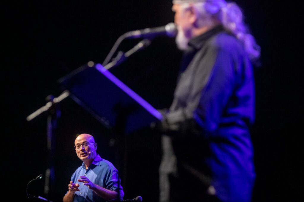 Il duce delinquente è un’incredibile storia a due voci: Aldo Cazzullo racconta, Moni Ovadia legge, con un registro canoro potente e imponente, i discorsi, gli ordini, i telegrammi e i dispacci di Mussolini e i testi delle sue vittime, con musiche e canzoni dell’epoca eseguite e interpretate dal vivo da Giovanna Famulari al pianoforte e violoncello (a tratti suona anche l’armonica). Ovadia è magistrale. Recita e canta in italiano, greco, spagnolo, tedesco. Un vero istrione.