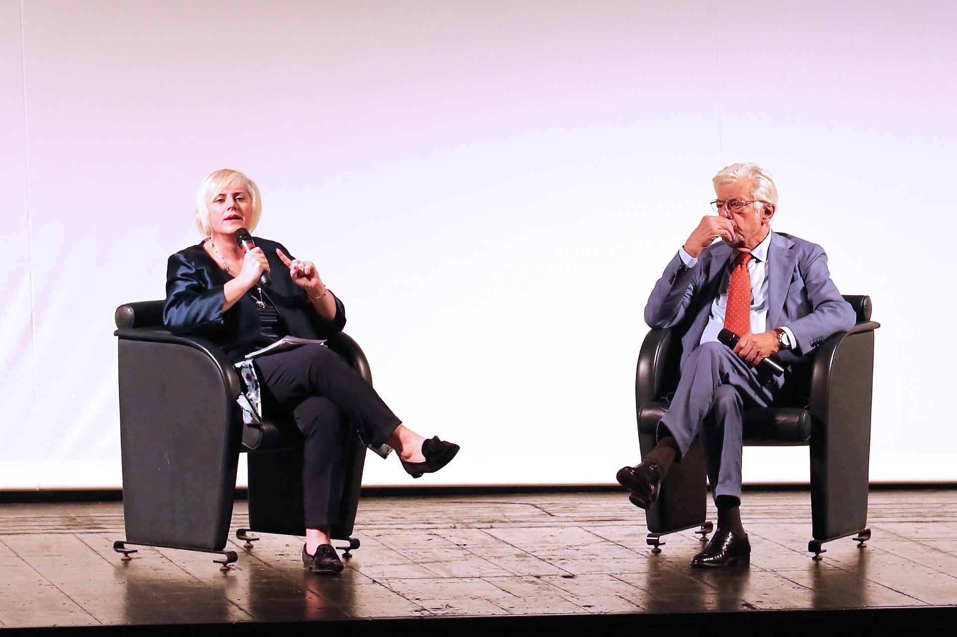 Lo aspettavano tutti, giovani e meno giovani. Porta con sé la storia del cinema e del nostro paese. Sul palco del Teatro Nuovo ci sono solo due sedie: una per lui, il Maestro Giancarlo Giannini, e una per Anna Bisogno, Professore associato di cinema e televisione all’Università Mercatorum, l’ateneo digitale delle Camere di Commercio italiane, con il non semplice compito di accompagnarlo in un dialogo con il pubblico che sarà un’emozione meravigliosa. Sarà bravissima. L’incontro è avvolgente, caloroso, empatico, intenso, di quelli che non si dimenticano e restano, per sempre, una ricchezza del cuore e dell’anima.