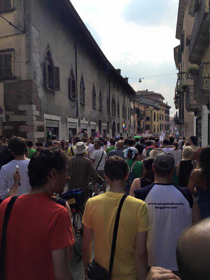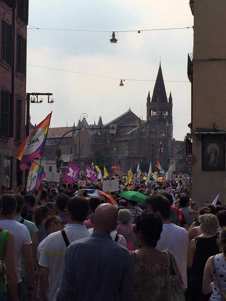 Contrariamente ai timori iniziali dettati dall’organizzazione di una contromanifestazione omofoba, con cattolici tradizionalisti ed estrema destra veronese (tra i promotori il circolo Christus Rex e Forza Nuova), la città dell’amore ha accolto i manifestanti in modo festoso e pacifico.
