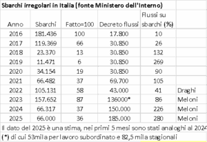 Nessuno vuole gli immigrati illegali per cui il Governo (da anni) emana flussi legali (quest’anno 185mila) che però si traducono in arrivi effettivi solo in un caso sui 4 programmati (25%). Anche quest’anno succede così.