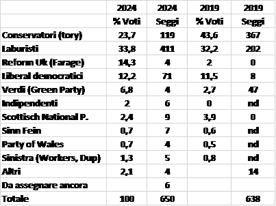 Dopo 14 anni di Governi dei Conservatori (Tory) dal 2010, vanno al Governo i Laburisti. Più che una vittoria dei Laburisti è stato un suicidio dei Conservatori minati anche dal nuovo partito di Farage di estrema destra (quello della Brexit) che ha avuto un enorme successo (14,3%). Così col sistema uninominale (un po’ medievale di GB) poiché chi arriva primo viene eletto, i laburisti ora hanno praticamente (con gli stessi voti di Corbyn del 2019) la maggioranza assoluta del Parlamento (411 seggi su 650).