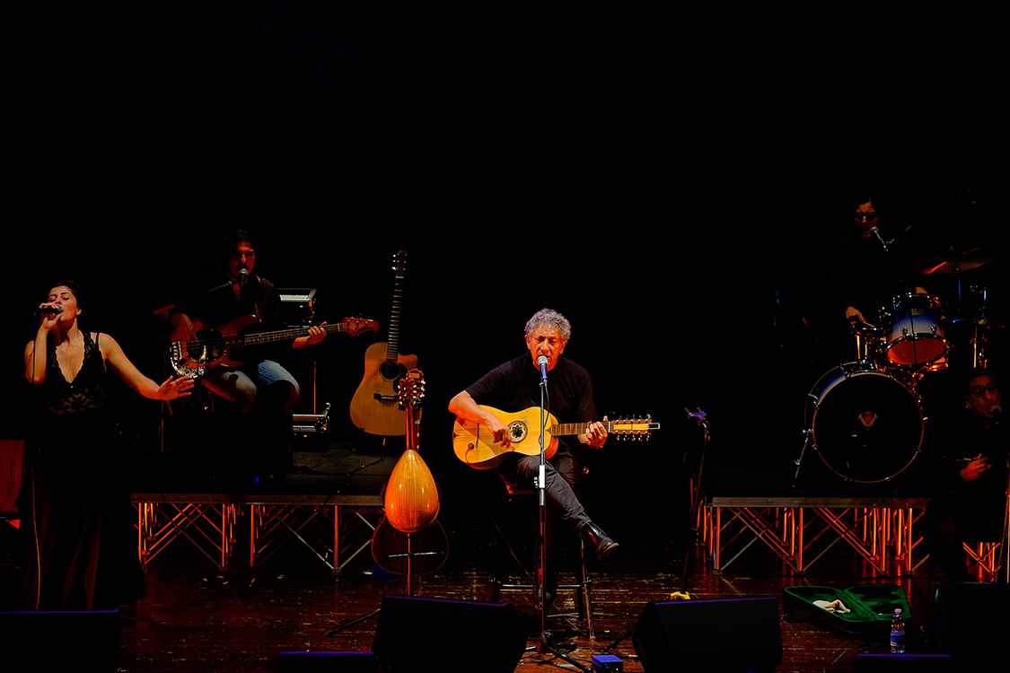 Ecco allora sul palco, oltre a un grandioso Eugenio Bennato, il sorprendente Mohammed Ezzaime El Alaoui (voce e viola) che viene da Casablanca in Marocco, la suadente e mediterranea Sonia Totaro (voce e danza pizzica e tarantina), Ezio Lambiase alle chitarre, il trentenne calabrese Stefano Mujura alla chitarra e al basso, la tonalità profonda e possente di una giovane anglo-napoletana Francesca Del Duca (voce e percussioni) che mettono insieme una strepitosa “musica di terza classe di chi parte contadino e arriverà terrone” [clicca per ascoltare “Grande Sud”].