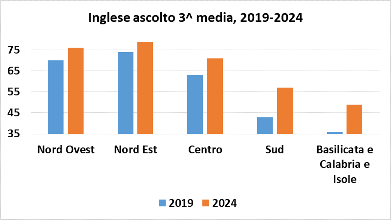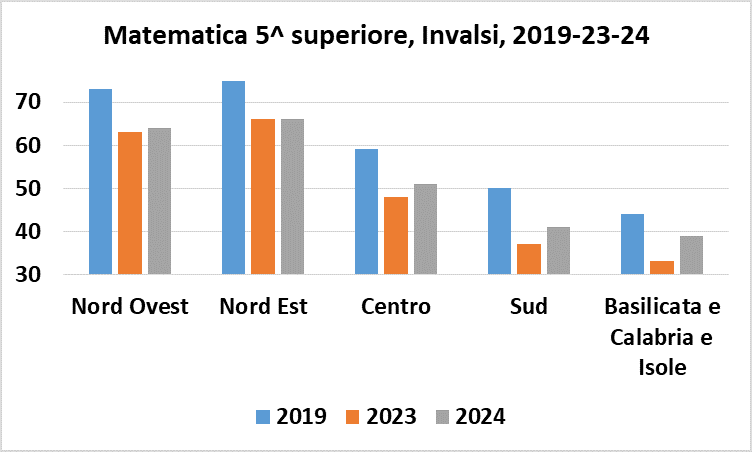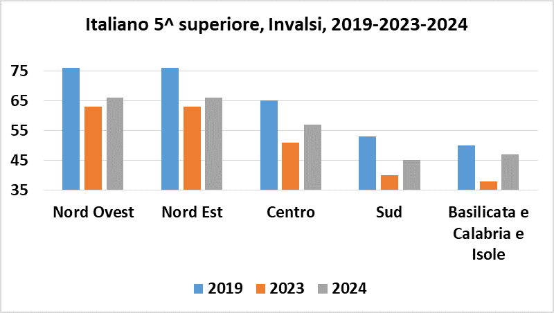 I risultati sono in lieve miglioramento rispetto all’anno scorso (specie per Inglese che migliora in modo costante da vari anni) ma, escluso Inglese, sono ancora peggiori di quelli pre-pandemia del 2019 sia per Italiano che Matematica. La lunga chiusura delle scuole nel 2020 (di cui l’Italia ha il record mondiale) e il passaggio alla DAD (Didattica A Distanza) ha inciso in modo devastante, per cui ancora nel 2024 non si è riusciti a raggiungere i livelli di apprendimento del 2019 per Italiano e Matematica. In Inglese si migliora ma potrebbe incidere la quota sempre più numerosa degli immigrati che hanno maggiori difficoltà in Italiano e Matematica, mentre, come dice lo stesso Rapporto Invalsi 2024 “sono maggiormente predisposti ad apprendere le lingue straniere poiché già esposti ad almeno due lingue (quella d’insegnamento e quella parlata a casa)”.