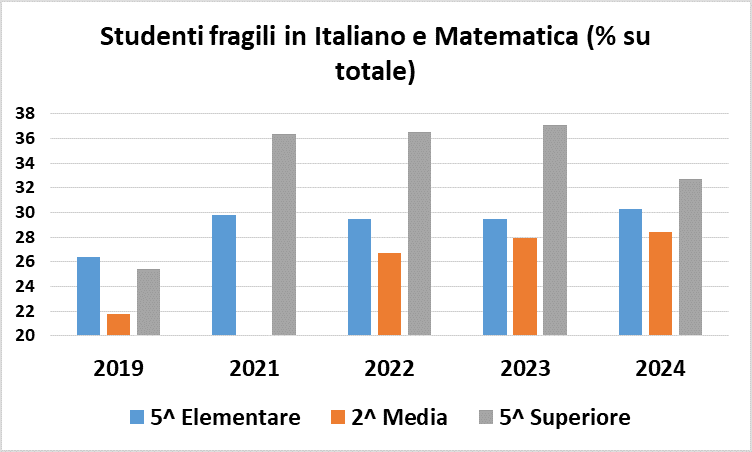 La dispersione “esplicita” (cioè chi non raggiunge il diploma) cala: dal 25% del 2001 al 10,5% del 2024 e si potrebbe quindi raggiungere l’obiettivo del PNRR (9% al 2026). Si tratta però di un dato più formale che sostanziale in quanto il diploma non garantisce che si siano raggiunti gli apprendimenti di base minimi. Il Rapporto infatti menziona che gli studenti “fragili” sia in Italiano che in Matematica dopo 13 anni di studi a scuola (al 5° anno delle superiori), che sono ancora ad un livello 1 e 2 (cioè non raggiungono la sufficienza) sono il 32,7%, cioè un terzo degli alunni, anche se in calo sul 2023, ma molti di più del 2019 quando erano “solo” il 25,4% (+7,3 punti).
