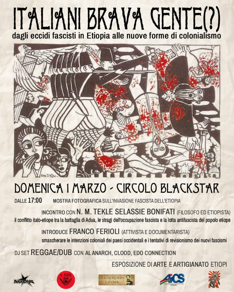 Giornata di Lutto Nazionale nella Repubblica Federale Democratica di Etiopia in memoria delle vittime dei massacri del colonialismo italiano e per questo ci proponiamo di riscoprirne la storia con l’etiopista Nicolò Matyas Tekle Selassie Bonifati, attraverso una mostra fotografica sull’invasione fascista dell’Etiopia e un incontro con dibattito sul tema.