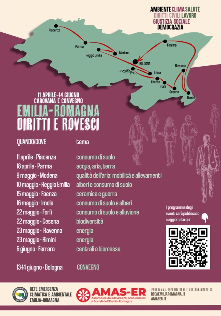 Per 2 mesi, partendo da Piacenza e attraversando tutti i comuni capoluoghi di provincia e anche altre città, si svilupperà la Carovana sui temi ambientali e sociali promossa da RECA (Rete Emergenza Climatica e Ambientale Emilia-Romagna) e da AMAS (Assemblea Movimenti Ambientali e Sociali Emilia-Romagna), per poi concludersi con un importante convegno regionale il 13 e 14 giugno a Bologna.
