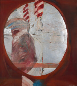 Già dal debutto – in questa sala – appaiono poi i temi che rimarranno ricorrenti e che sono tutti radunati nell’olio su tela intitolato Lo specchio del 1967: il riflesso, le righe, un pezzo di corda, l’intruso.